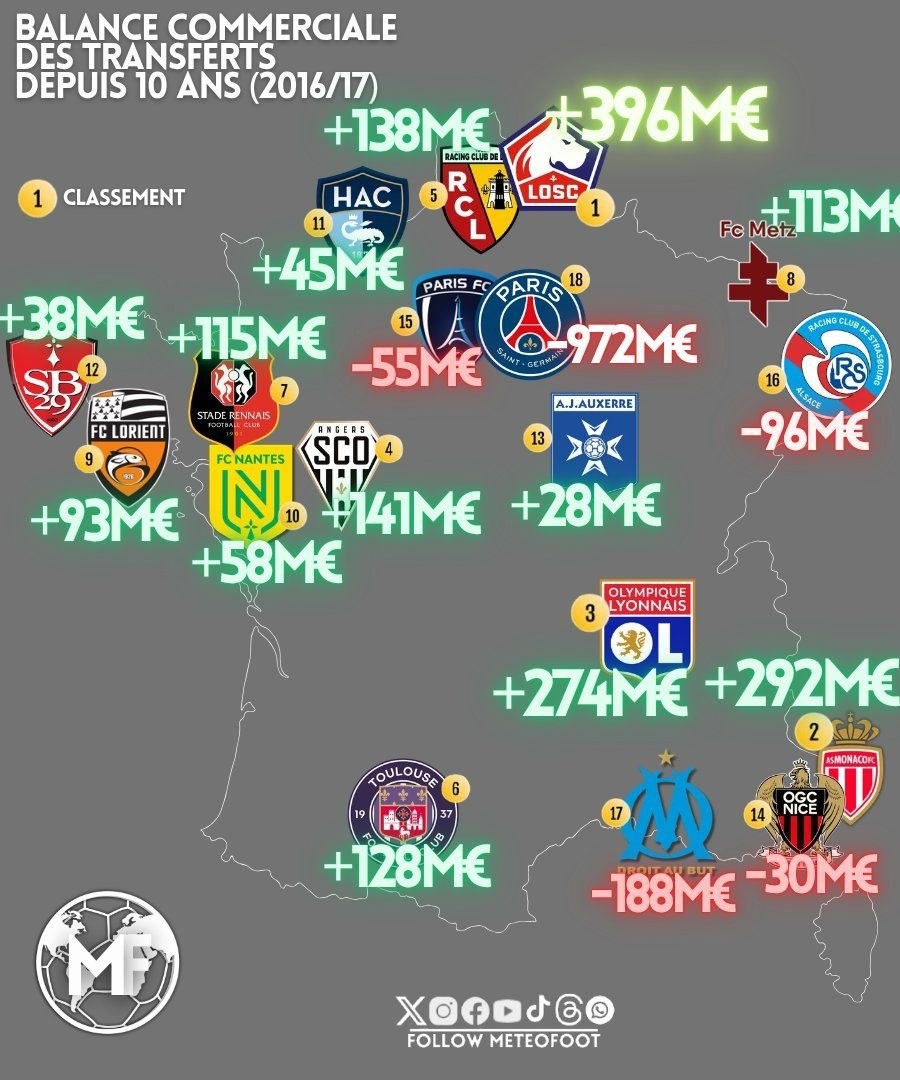 Трансферный баланс команд Лиги 1 за последние 10 лет!
