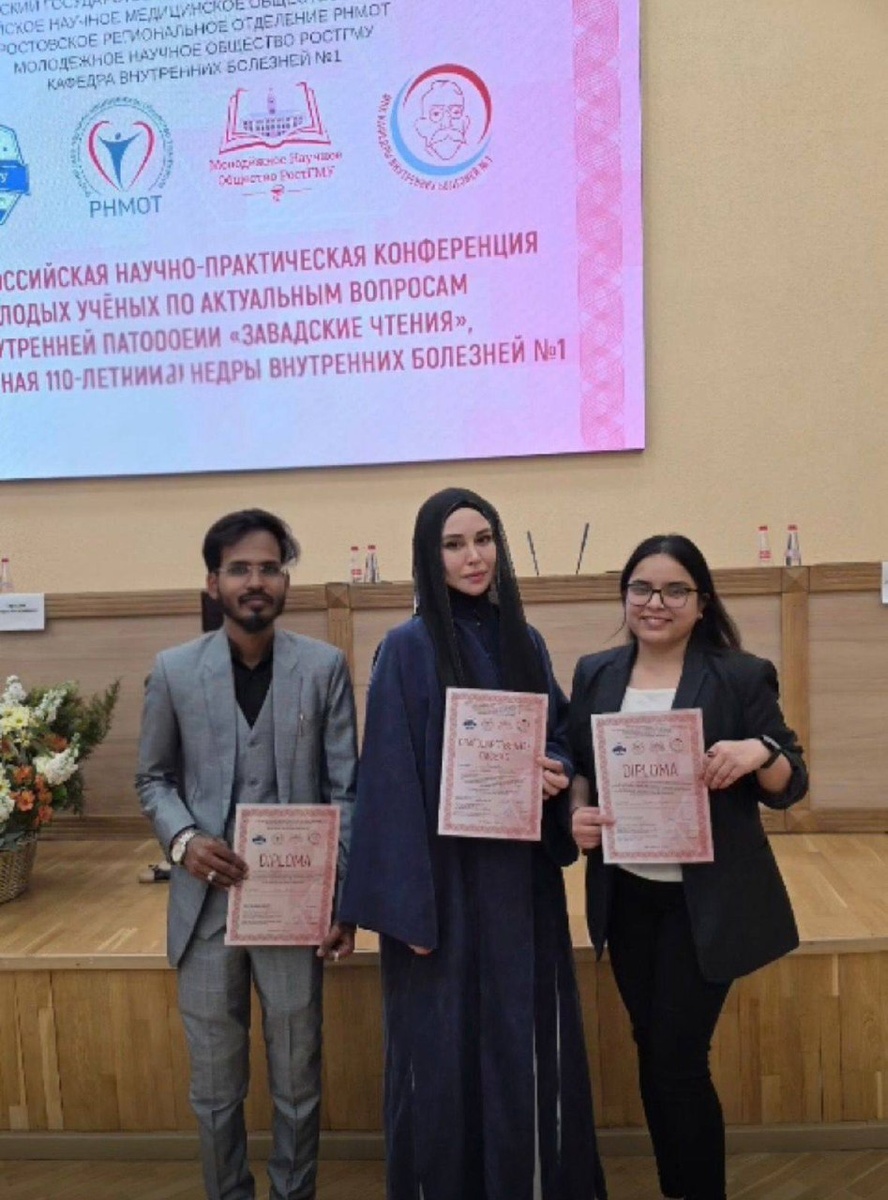 »! Студенты 4 курса Медицинского института им. А. Х. Аушева ИнгГУ — Шайк Фероз и Дивьяни — приняли участие в научно-практической конференции «Завадские чтения», организованной РостГМУ Минздрава России. 📌 В секции «Трудный пациент» ребята выступали на английском языке и получили дипломы за свои доклады. Научный руководитель, старший преподаватель кафедры «Факультетская терапия» Нальгиева Макка Абубукаровна, отмечена благодарностью за активное участие. 🏆 Дипломы, призы и благодарственное письмо от РостГМУ будут переданы в музей Медицинского института им. А. Х. Аушева ИнгГУ. 🙌 Организаторы конференции — профессор Анна Ивановна Чесникова и доцент Александр Алексеевич Галушкин — выразили благодарность ректору ИнгГУ Фатиме Юсуповне Албаковой и директору Медицинского института Хаве Мусаевне Ахриевой за высокий уровень подготовки участников.
