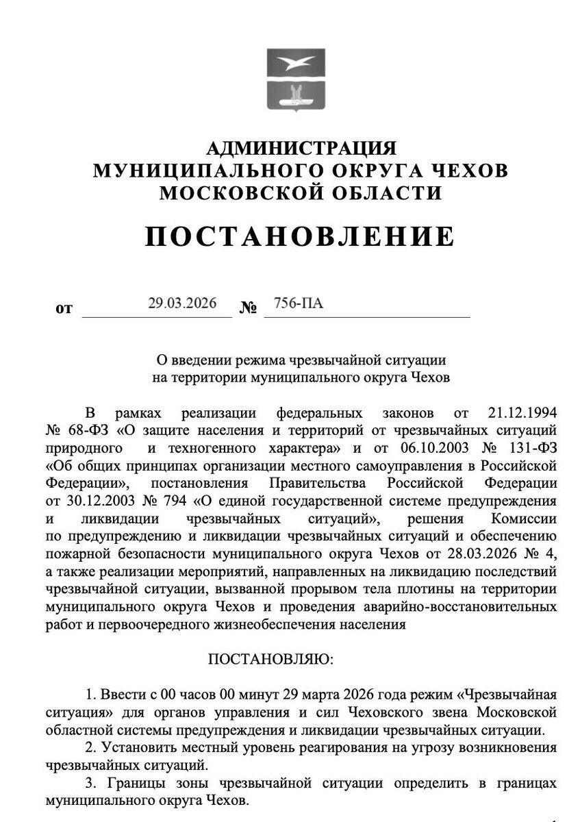Он начал действовать 29 марта и затрагивает всю территорию округа. Соответствующее постановление выпустила администрация муниципалитета. Отмечается, что документ принят в рамках в том числе “реализации мероприятий, направленных на ликвидацию последствий чрезвычайной ситуации, вызванной прорывом тела плотины на территории муниципального округа Чехов и проведения аварийно-восстановительных работ и первоочередного жизнеобеспечения населения”. В соответствии с 4 пунктом постановления, администрация округа должна обеспечить информирование жителей о введении режима чрезвычайной ситуации. Однако до сих пор никаких пояснений дано не было. Видимо, профильный заместитель главы Чехова Вадим Шевырев, курирующий сферу безопасности, решил, что чем меньше жители округа знают, тем крепче они будут спать. Трогательная забота. Особенно с учетом того, что именно Вадим Шевырев был одним из инициаторов и исполнителей кампании по уничтожению уличного радио, включенного в систему оповещения гражданкого насел