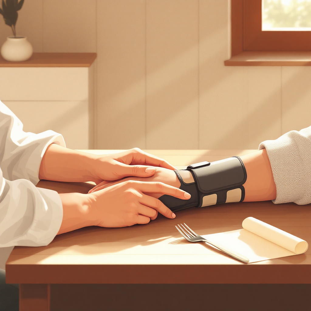 * Стабилизация запястья: Упражнения с легкой резиновой лентой (сгибание/разгибание кисти с сопротивлением).