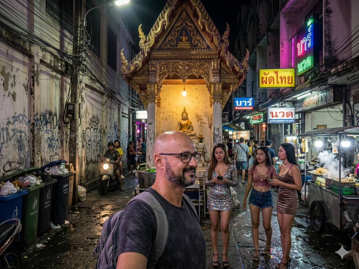 Бангкок. Утро. Я иду мимо храма Ват Пхо. Золото, монахи в оранжевом, туристы с почтительными лицами. Красиво. Серьёзно. Духовно.