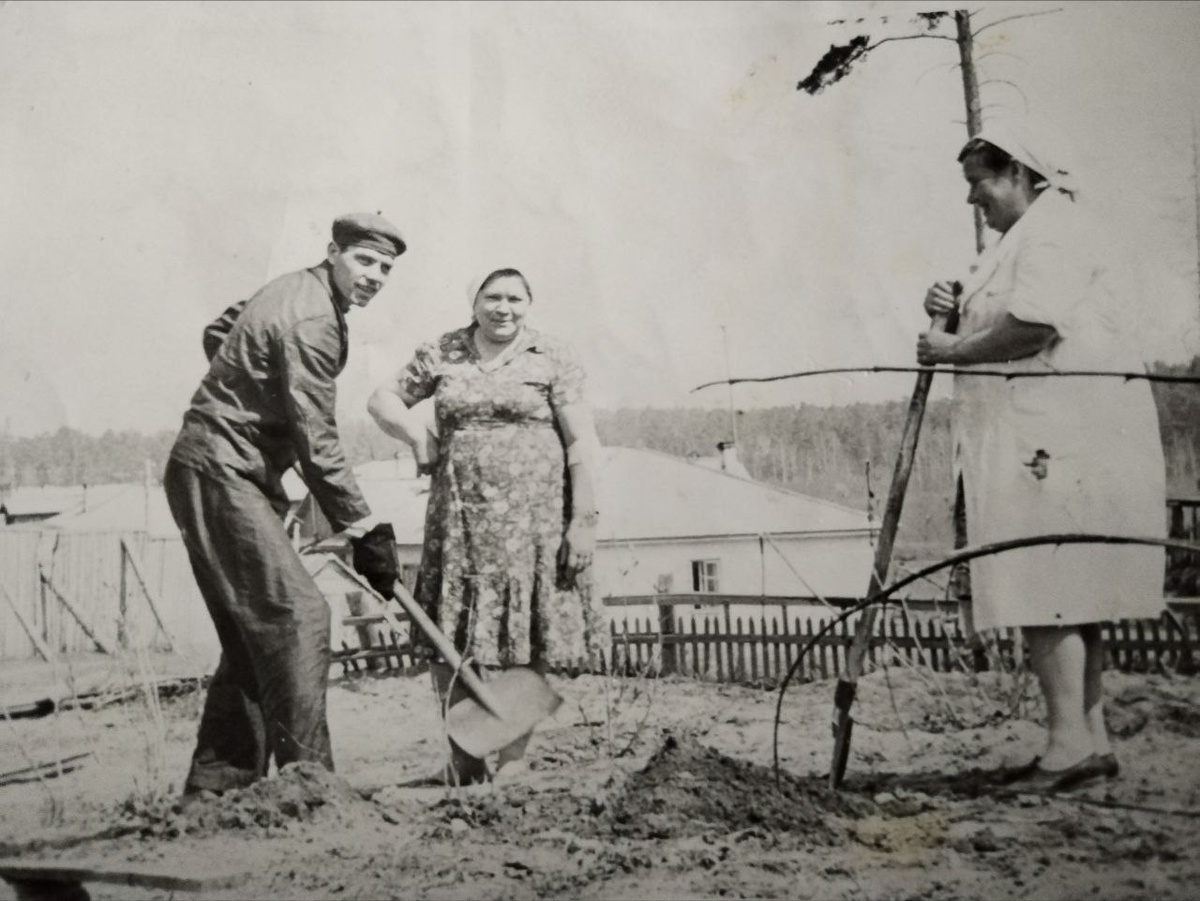 ПУБЛИКУЕТСЯ ВПЕРВЫЕ Здравствуйте! На снимке 1967 года моя бабушка (справа) и её соседи по бараку высаживают саженцы на территории Тубдиспансера (ныне садик Кораблик). Позади виднеются бараки, которые располагались тогда на нынешней территории школ 121 и 119 А через 5 лет на месте старых бараков будет построена школа № 121, в которой учился мой отец, я, а теперь учится мой сын.🫶 Фото сделано с ракурса от современного дома Тружеников 7. Левее от забора - находятся двухэтажки Тружеников, 12 и 14, но на фото их не видно. По тем временам это были шикарные дома с коммуникациями внутри!)) Фото из семейного архива автора - жительницы Шлюза Елены Грин.