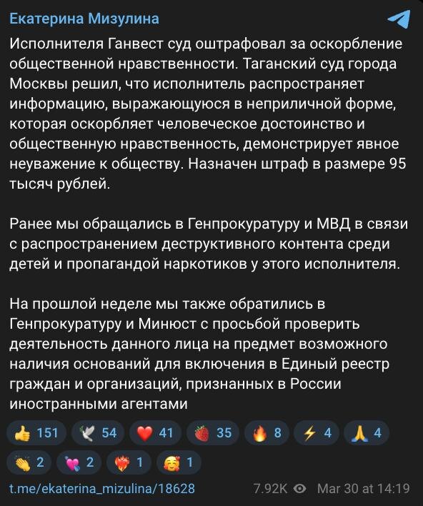 ⚡Также Екатерина Мизулина на прошлой неделе обратилась в Генпрокуратуру и Минюст с просьбой проверить деятельность Ганвеста для включения его в Единый реестр граждан и организаций, признанных в России иностранными агентами @mainstreamusic