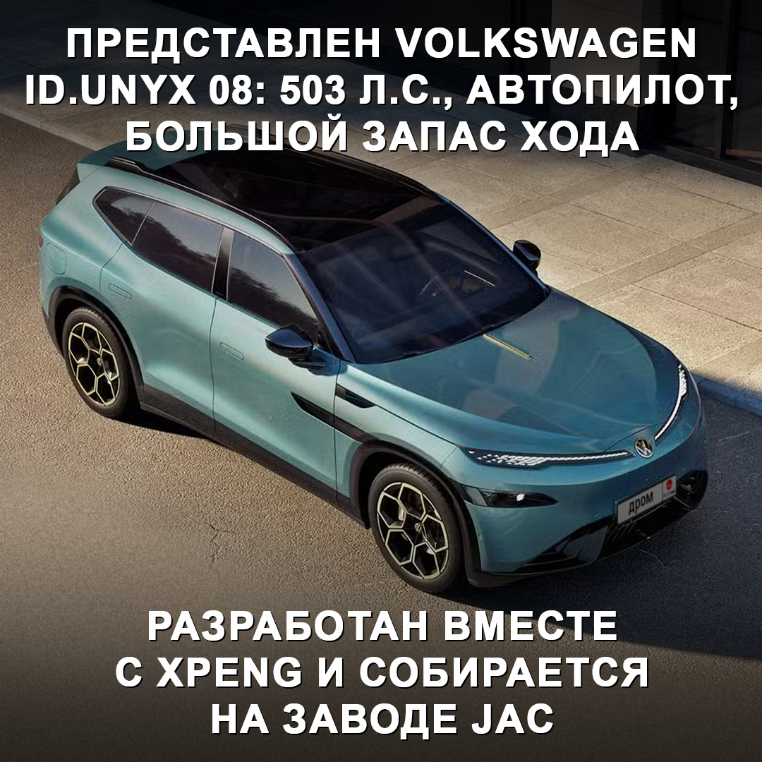 Представлен кроссовер ID.Unyx 08, который разработан вместе с Xpeng и собирается на заводе JAC 🤨 Новинка — это 5-метровый электромобиль с 3-метровой колёсной базой, 800-вольтовой архитектурой, пневмой и адаптивными амортизаторами. У ID.Unyx 08 выдвижные ручки, безрамочные стёкла на дверях, панорама и колёсные диски 21”. Также среди оснащения большие экраны на передней панели, беспроводные зарядки, кресла с подогревом, вентиляцией и массажем, а также автопилот и голосовой помощник с ИИ. Силовая установка состоит из одного электромотора сзади на 313 л.с. или из двух двигателей на 503 л.с. Запас хода — 730 км. Цена в Китае — немногим дешевле 3 000 000 ₽. Как думаете, дойдёт до того, что Volkswagen просто будет продавать китайские модели по всему миру? 🤔 #дромновость #китай #volkswagen #idunyx08 #электромобиль