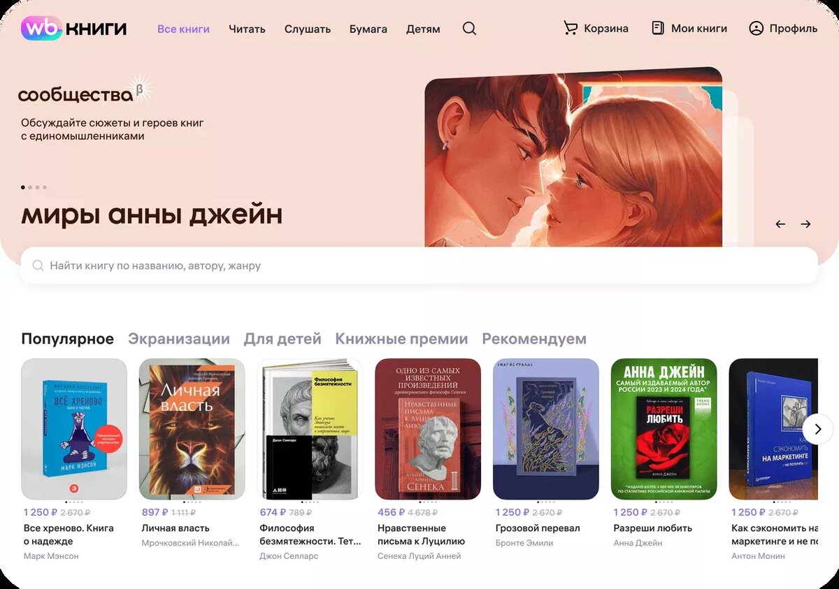 Компания RWB (Объединенная компания Wildberries & Russ) открыла доступ для скачивания тестовой версии приложения WB Книги для всех желающих. Оно доступно в Google Play, AppStore и RuStore. Источник: Wildberries В приложении и его десктопной версии есть витрина печатных книг, которые можно положить в корзину на Wildberries, а также библиотека цифровых изданий в текстовом и аудиоформате. Обсудить персонажей, сюжеты и идеи произведений пользователи могут в тематических сообществах в приложении. Например, одно из них посвящено творчеству Анны Джейн — одного из самых издаваемых российского авторов художественной литературы последних лет. Список таких комьюнити и функциональных возможностей платформы будет постепенно расширяться в ходе тестирования. В планах — добавление инструментов для оцифровки текстов и учебы, AI-помощники и многое другое. «В наших планах, что WB Книги со временем превратится в пространство, где можно не только читать в любом формате или слушать книги, но и учиться, нахо