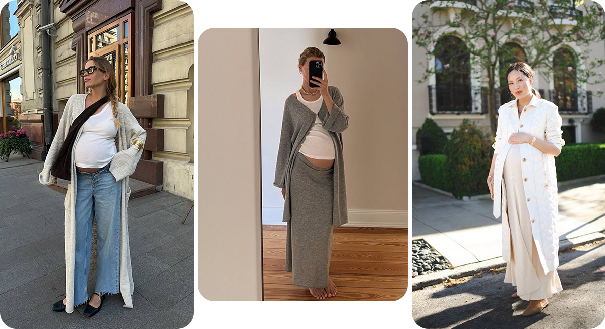 Беременность — время, когда хочется чувствовать себя комфортно, но при этом оставаться стильной. Ситуацию усложняет постоянно меняющийся силуэт и непредсказуемые потребности тела. О том, какие вещи купить, чтобы было удобно и при этом не пришлось каждую неделю обновлять гардероб, рассказываем в статье. Мягкий оверсайз-кардиган не только согреет, но и поможет скорректировать силуэт, особенно в последние месяцы беременности, когда живот станет сильно заметен. Оптимальный вариант — кардиганы из тонкого трикотажа с V-образным вырезом, так как они визуально вытягивают фигуру. А длина до середины бедра и ниже удобна тем, что не «обрезает» силуэт и хорошо сочетается как с платьями, так и с брюками. Классический тренч — беспроигрышный вариант для межсезонья. Беременным советуем выбрать модель из мягкой ткани с небольшим содержанием стрейча и регулируемым поясом, который можно завязывать выше талии. Тренч легко адаптируется к растущему животу и не потеряет форму после родов. Носить его можно с