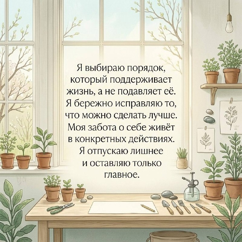 Сегодняшний день похож на светлую мастерскую в оранжерее, где на столе лежат инструменты и стоят в ожидании пересадки молодые, полные сил, растения, которым уже тесно в старых горшках. В этой мастерской не создаются шедевры за мгновение, чудо возникает только посредством длительной кропотливой работы и любви. И иногда целый день может уйти на то чтобы подготовить инструменты, обработать или отсортировать растения, или вообще весь день проковыряться с одним горшком. Каждый маленький шаг, кажущийся незначительным, — на самом деле, нужный кирпичик в стене. Что есть в этом пространстве: - Желание привести дела, тело, мысли в более порядок. - Повышенная чувствительность к деталям, мелким несоответствиям и тому, что давно требует внимания. - Потребность в полезном, конкретном действии без излишней нагрузки на нервную систему. - Плавное, устойчивое движение вместо впечатляющих рывков и вау-эффектов. - Важно мало и качественно, а не много и кое-как. Чего лучше избегать: - Превращать стрем