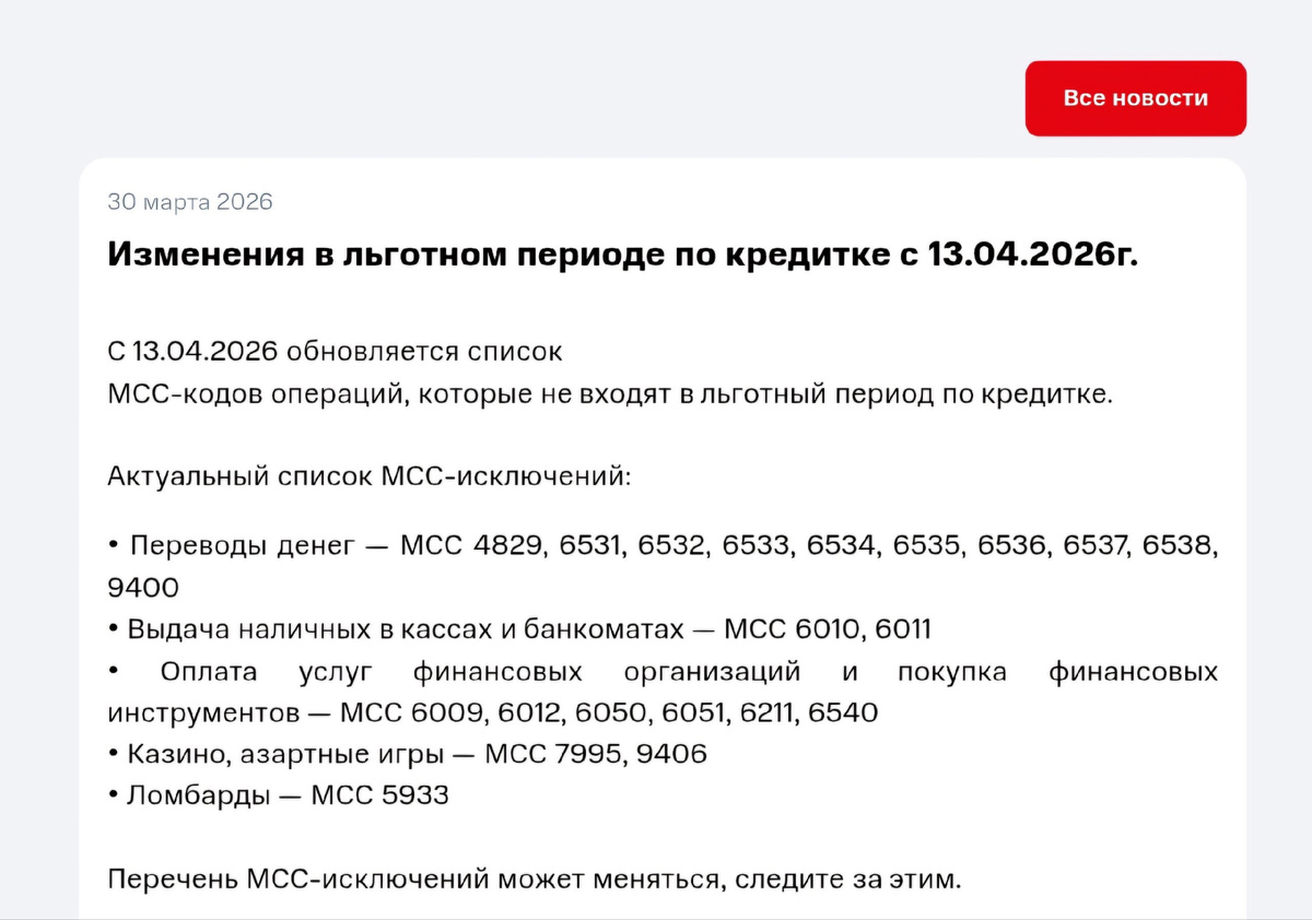 ⚡️С 13.04.2026 обновляется МСС-кодов, которые не входят в льготный период по кредиткам МТС