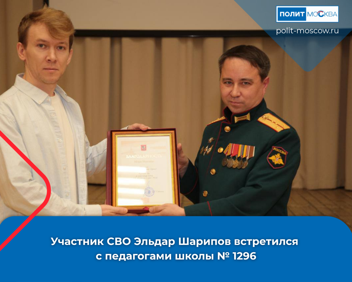 Особое внимание гость уделил партпроектам «Историческая память» и «Новая школа» в рамках которых ведётся работа по восстановлению памятников, а также открытию Парт Героев в школах. Кроме того, предлагается присваивать учебным заведениям имена защитников Отечества — от участников Великой Отечественной войны до бойцов СВО.Эльдар Шарипов рассказал, что в 2024 году школе № 1794 было присвоено имя Александра Чуфистова, муниципального депутата от «Единой России», погибшего на СВО, а к 9 Мая планируется открыть мемориальную доску в его честь. «Александра хорошо знали и глубоко уважали как директора школы — человека, которому доверяли и которого искренне ценили. Он был истинным патриотом, посвятившим жизнь служению России и воспитанию молодого поколения. Светлая память о нём навсегда останется в сердцах всех, кто знал и работал с ним», — отметил Шарипов. В завершение встречи Эльдар Шарипов вручил учителю истории благодарность мэра Москвы за значимый вклад в воспитание молодёжи и отдельно побла