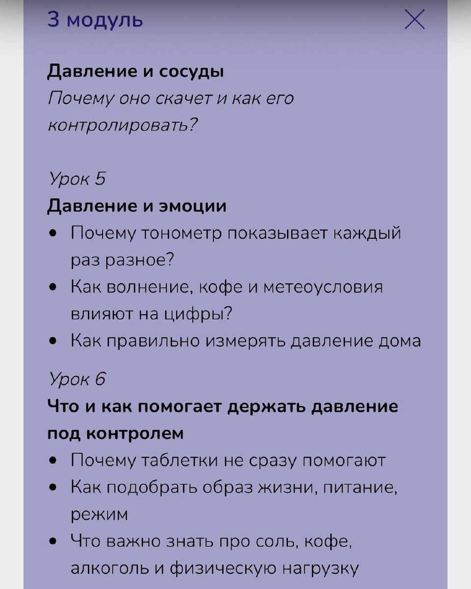 Давление и сосуды: “почему вы лечите не то, что нужно” Одна из самых частых ошибок при давлении: человек лечит цифру на экране тонометра. Пример: — давление 150/95 на фоне тревоги → человек пугается → меряет 10 раз → давление растёт ещё больше → “таблетка на всякий случай” → качели. Что на самом деле важно? ✅ правильная техника измерения ✅ регулярность и дневник ✅ понимание: где реакция на стресс, а где устойчивое повышение ✅ роль сна, веса, соли, алкоголя, физической активности ✅ когда реально нужны препараты и как ставить адекватные цели Что вы получите в Модуле 3? • протокол измерения давления дома • дневник, который действительно помогает • понимание лечения: где привычки, где препараты, где сочетание Результат: меньше тревоги и больше контроля. Не “каждые 10 минут с тонометром”, а спокойная система. ⚠️ Важно: сейчас уже нет возможности анализировать анкеты. Если вам интересно обучение в КардиоКлубе, то напишите в мою службу заботы за информацией по условиям обучения. Писать