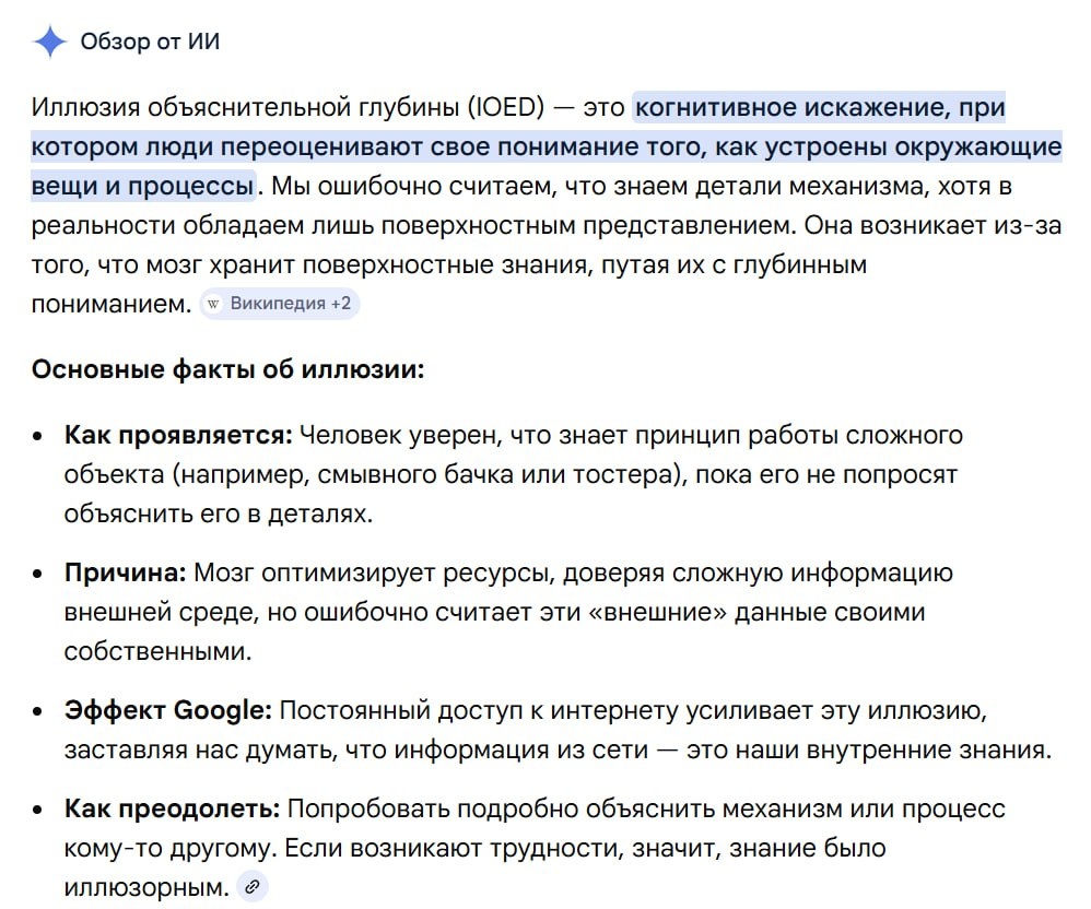 Есть одно когнитивное искажение, про которое почти не говорят в маркетинге, хотя сталкиваемся мы с ним постоянно. Называется оно довольно неприметно — иллюзия объяснительной глубины. Суть в том, что человеку кажется, что он хорошо понимает, как что-то работает… до момента, пока его не просят это объяснить. 📎 Потому что в голове «я понимаю» очень часто означает не реальное понимание, а ощущение знакомости. Мы видели, слышали, пользовались — и мозг достраивает картину. Создаётся ощущение, что знаний достаточно. 🚲 Самый простой пример — попробуйте объяснить, как работает велосипед. Пока не начинаешь говорить, кажется, что всё очевидно. А потом внезапно выясняется, что объяснить баланс, поворот и движение не так уж просто. ✖️ В маркетинге это проявляется особенно ярко. Очень часто внутри команды есть ощущение: «мы понятно объяснили продукт», «у нас очевидная ценность», «и так ясно, зачем это нужно». И внутри команды это действительно так. Потому что там есть контекст: знание продукта