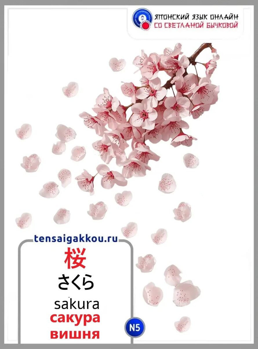 👋☺️Сегодня запоминаем слово 桜 / さくら / sakura - сакура, вишня (неплодоносящее дерево). ✳️ Объяснение значения слова на японском языке (продвинутый уровень): ロシア語では "сакура" または "вишня" と訳されますが、日本で「桜」といえば、実を食べるための木ではなく、花を観賞するための木を指します。春に白やピンク色の美しい花を咲かせます。日本の「国花」の一つとして、古くから日本人に愛されています。 Примеры предложений: 桜 さくら sakura сакура, вишня (не плодоносящее дерево) 1. 公園に桜が咲きました。 Kouen ni sakura ga sakimashita. В парке зацвела сакура. 2.. 桜の花はとてもきれいです。 Sakura no hana wa totemo kirei desu. Цветы сакуры очень красивые. 3. 明日、一緒に桜を見ませんか。 Ashita, issho ni sakura o mimasen ka? Не хотите ли завтра вместе посмотреть на сакуру? 4. 日本人は桜が大好きです。 Nihonjin wa sakura ga daisuki desu. Японцы очень любят сакуру. 🎧 Слушайте эти предложения на японском языке на нашем канале в MAX 👈 Для практики составляйте свои примеры предложений на японском языке и пишите их в комментариях для проверки 👌 🔴 🔗 Бесплатно записаться на онлайн-курс по запоминанию японских иероглифов