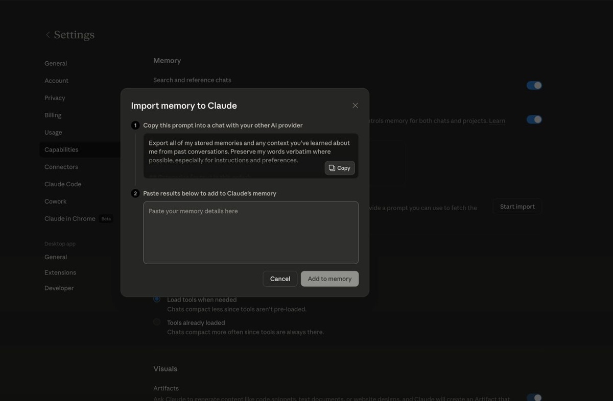 Многие сидят на ChatGPT или Gemini месяцами или годами. За это время ИИ запоминает про вас всё: стиль общения, проекты, предпочтения, даже какой язык программирования вы используете. И вот вы хотите попробовать Claude — но начинать с нуля? Заново объяснять кто вы, чем занимаетесь, как вам отвечать? Лень. Понимаю. Anthropic сделали штуку, которая решает это в три шага: 1️⃣ Заходите на claude.com/import-memory (или Settings → Capabilities → Import) 2️⃣ Копируете готовый промпт оттуда и вставляете в ChatGPT / Gemini / Grok — любой ИИ, которым пользуетесь сейчас 3️⃣ ИИ выдаёт блок со всем, что знает о вас. Копируете его и вставляете обратно в Claude Claude подхватывает ваш контекст и с первого сообщения общается так, будто вы давно знакомы. Важный нюанс: память доступна на платных планах. На бесплатном можно вставить экспорт прямо в чат — будет работать в рамках сессии. Если давно хотели попробовать Claude, но останавливало «опять всё с нуля» — теперь этого барьера нет.