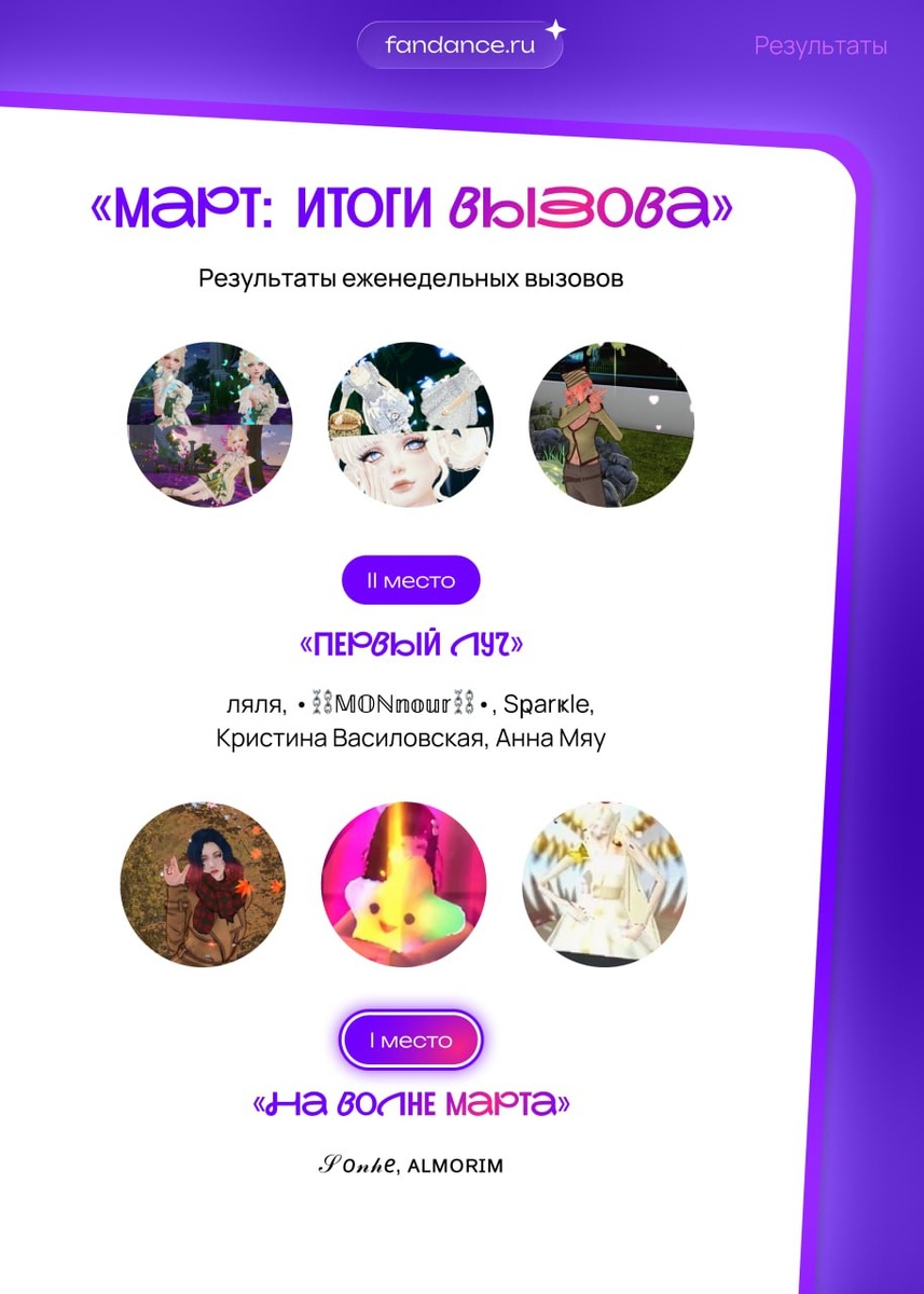 ! Благодарим каждого за проявленную активность, лайки и комментарии. Выражаем большую благодарность каждому, кто принял участие в мартовских состязаниях. Мы бросали вызов модникам, танцорам, друзьям и даже играм! Как вы знаете, мы всегда отмечаем каждого участника и присуждаем «виртуальные награды» за участие. В этот раз, у нас есть 2 места. 🎁 II место и звание «Первый луч» получают: ляля, •⛓️𝕄𝕆ℕ𝕟𝕠𝕦𝕣⛓️•, Sҏarҝle, Кристина Василовская, Анна Мяу 🎁 I место и звание «На волне марта» получают: 𝒮𝑜𝓃𝒽𝑒 и ᴀʟᴍᴏʀɪᴍ Еще раз, благодарим каждого за активность! Ожидайте новых вызовов в танцевальных вселенных 🪩
