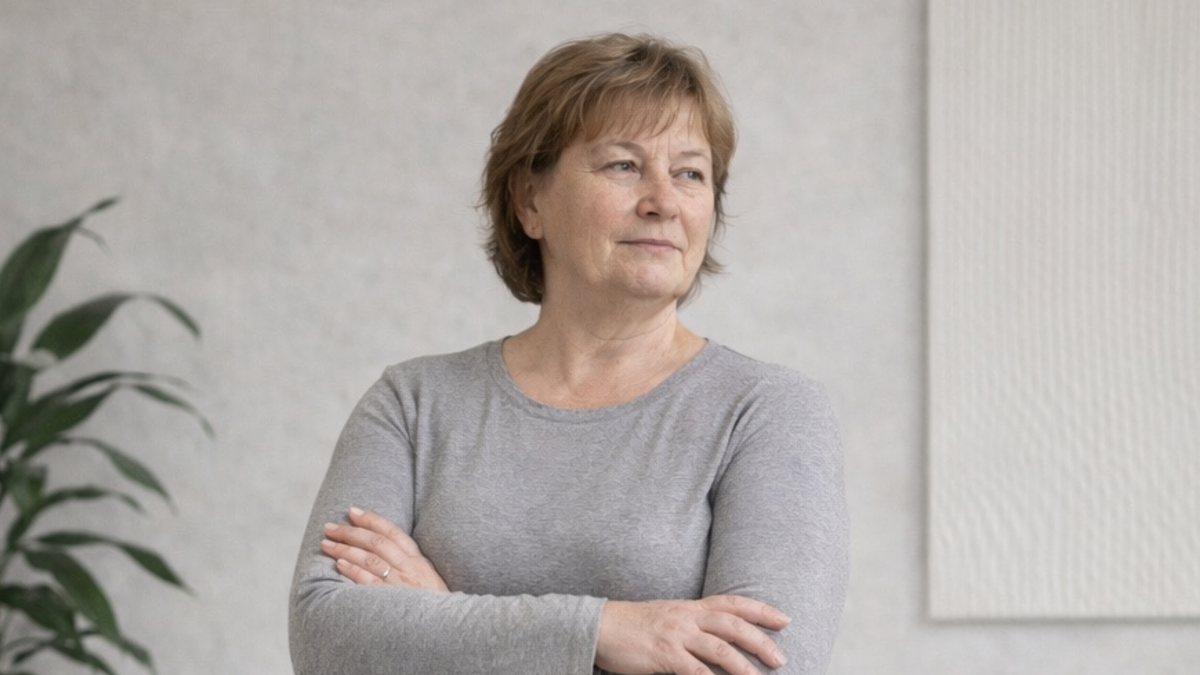 Вот это вообще хороший прием: брать строговатую основу и сверху давать ей вещь с более свободным характером. Тогда база не выглядит скучной. Она становится опорой, а не главным высказыванием. Здесь лонгслив как раз работает именно так. Он не спорит с рубашкой, а просто держит спокойный слой у лица и не дает образу рассыпаться на цвет и клетку.