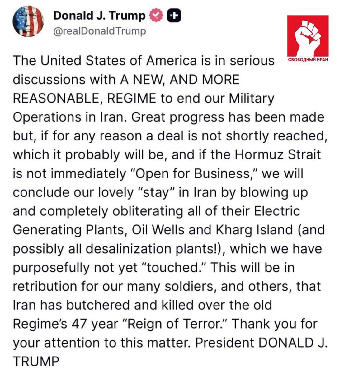 🚀💥 Трамп заявил, что в случае срыва сделки США могут уничтожить нефтяную и энергетическую инфраструктуру Ирана, включая электростанции, скважины и остров Харк. В его публикации также звучит ультиматум по Ормузскому проливу. Подпишитесь на канал