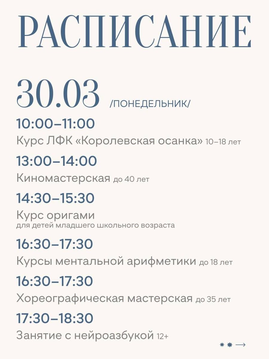 Друзья, на этой неделе нас ждет более 30 встреч в Манеже 🌺 Пора заглянуть в расписание с 30 марта по 5 апреля. Выбирайте: каллиграфия, новая лекция по истории России, встречи с психологами или киноклуб — будет интересно! А еще в Манеже новинки! Приглашаем на курс по ментальной арифметике: повышайте скорость концентрации и тренируйте память. Вход свободный, но, пожалуйста, регистрируйтесь заранее. Напоминаем, что событие состоится при записи от 10 человек. Встречаемся в молодежном центре «Манеж»: Кремль, 1А, южный вход. Ориентируйтесь по геолокации и приходите за творчеством, вдохновением и новыми знакомствами! 💬 МАХ