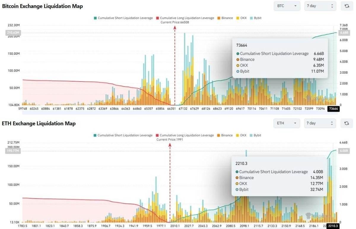 According to heatmap data, a move to $73,500 would liquidate approximately $6.6 billion in short positions on Bitcoin. For Ethereum, reaching the $2,200 level targets around $4 billion in liquidations.