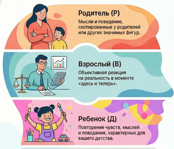 Транзактный анализ (ТА) — это система анализа личности и способов взаимодействия между людьми. Согласно этой модели, в каждый момент времени человек находится в одном из трех эго-состояний, которые определяют его реакции, слова и поведение. Три эго-состояния личности Эго-состояние представляет собой совокупность связанных между собой чувств, мыслей и паттернов поведения. Состояние, в котором человек воспроизводит нормы, правила и установки, заимствованные у родителей или других авторитетных фигур. Состояние, ориентированное на сбор и объективную обработку информации о реальности «здесь и сейчас». Состояние, в котором человек действует и чувствует так же, как в детстве. Механика общения: Транзакции Транзакция — это единица общения, состоящая из стимула (обращение одного человека) и реакции (ответ другого). ТА выделяет три вида транзакций, которые определяют ход любого диалога. Векторы общения направлены к тем состояниям, в которых находятся собеседники. Ответ соответствует ожиданиям отп