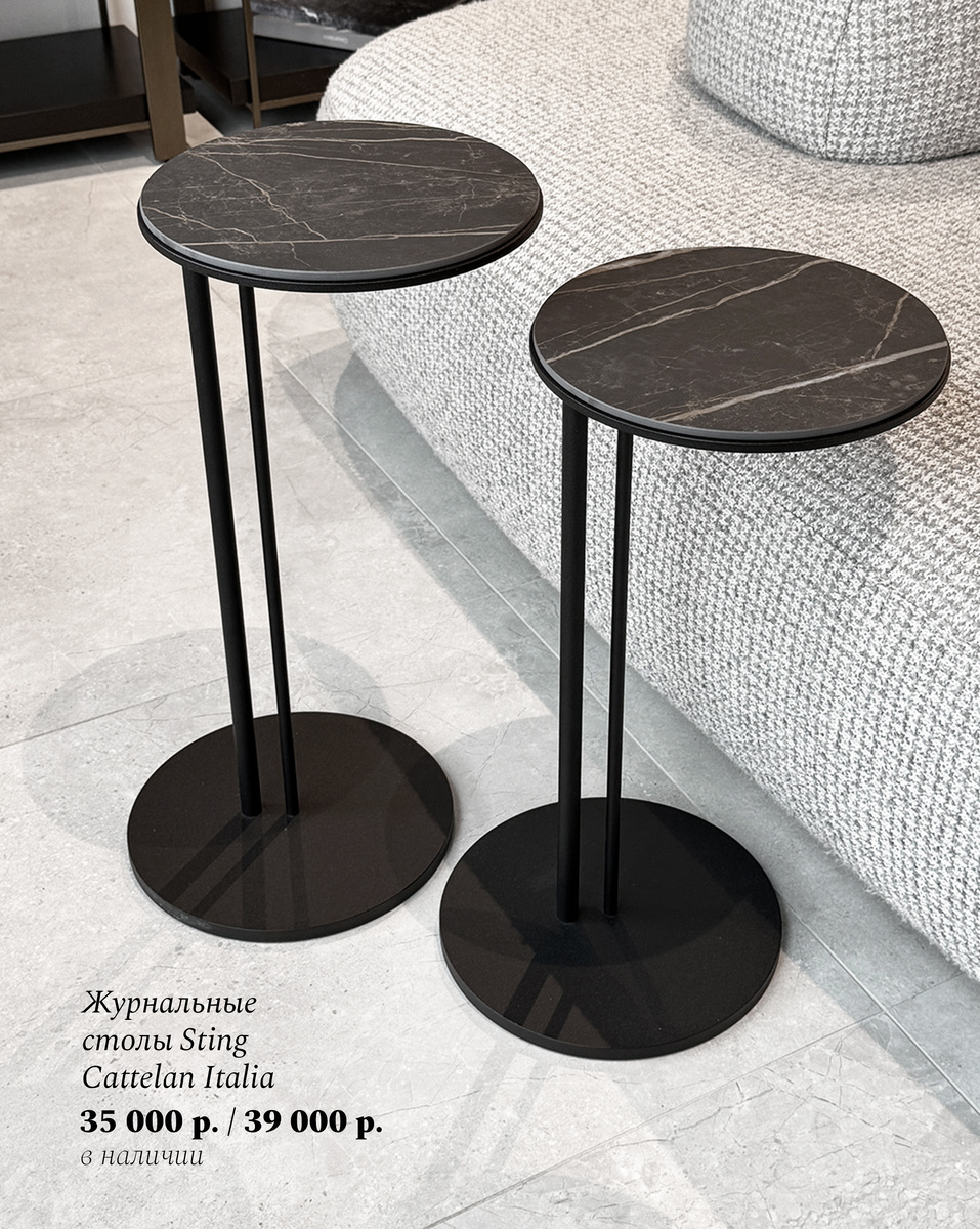 Журнальные столики Sting от Cattelan Italia — лаконичные модели с лёгким и графичным силуэтом. Тонкая металлическая опора и компактная круглая столешница создают минималистичный образ, который не перегружает пространство. Разные высоты позволяют использовать столики по отдельности или объединять в композиции рядом с диваном или креслом. Sting работают как функциональное дополнение и аккуратный акцент, сохраняя визуальную лёгкость интерьера. Ø 26 × 50 h — 35 000 руб.