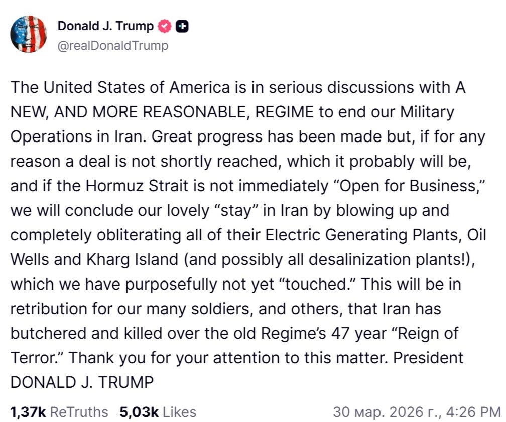 Был достигнут значительный прогресс, но, если по какой-либо причине соглашение в ближайшее время достигнуто не будет, что, вероятно, произойдет, и если Ормузский пролив немедленно не будет “Открыт для бизнеса”, мы завершим наше прекрасное “пребывание” в Иране взрывом и полным уничтожением всех их электростанций, Нефтяные скважины и остров Харг (и, возможно, все опреснительные установки!), которые мы намеренно еще не “трогали”. Это будет возмездием за многих наших солдат и других, что Иран устраивал бойни и убивал людей на протяжении 47-летнего “правления террора” старого режима. Спасибо вам за ваше внимание к этому вопросу. Президент ДОНАЛЬД Дж. ТРАМП ℹ️ Рынок на слова Трампа уже не реагирует. Натуральное фиаско...