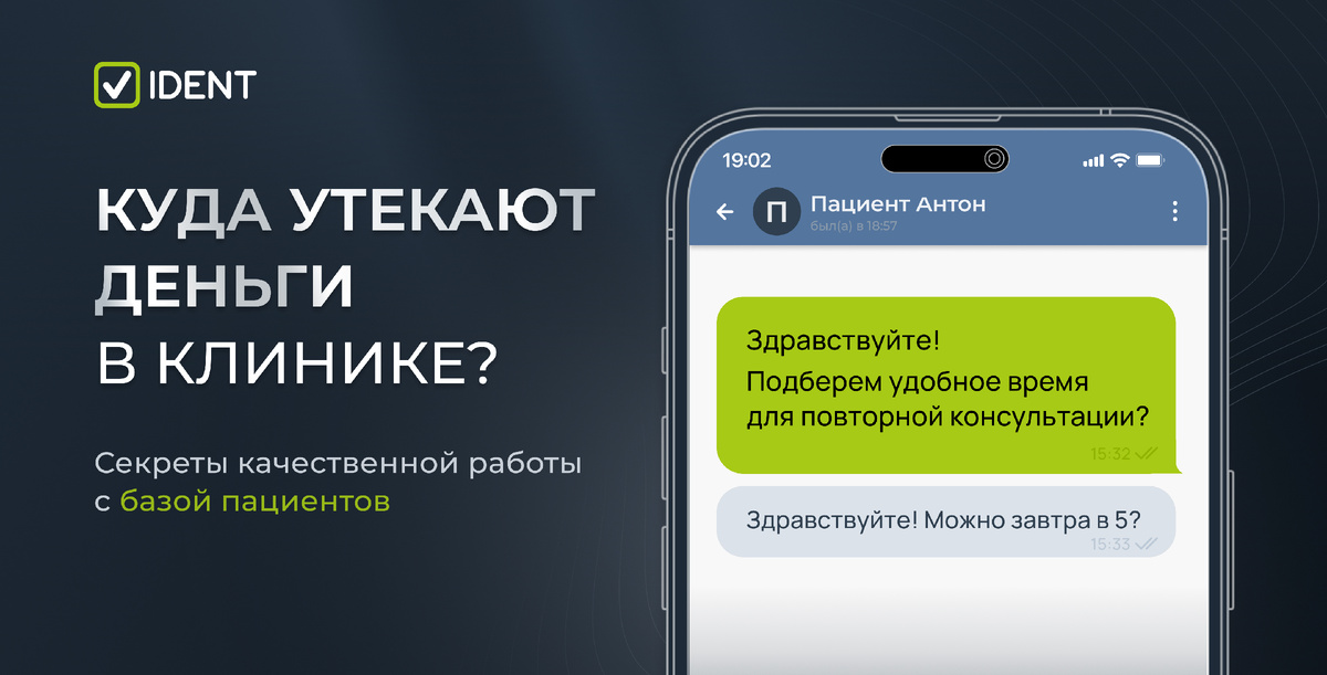 А IDENT поможет снять с администраторов ручную работу за счет автоматизации, вовремя увидеть проблемные зоны благодаря понятным отчетам, и в итоге увеличить выручку клиники😉