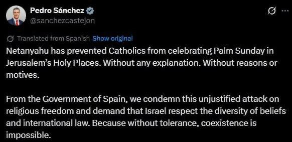 : «Нетаньяху помешал католикам отпраздновать Вербное воскресенье в святых местах Иерусалима. Без каких-либо объяснений. Без причин и мотивов. Правительство Испании осуждает эту необоснованную атаку на свободу вероисповедания и требует от Израиля уважать разнообразие убеждений и международное право. Потому что без терпимости сосуществование невозможно». Подпишись на Телеграм Александр Семченко