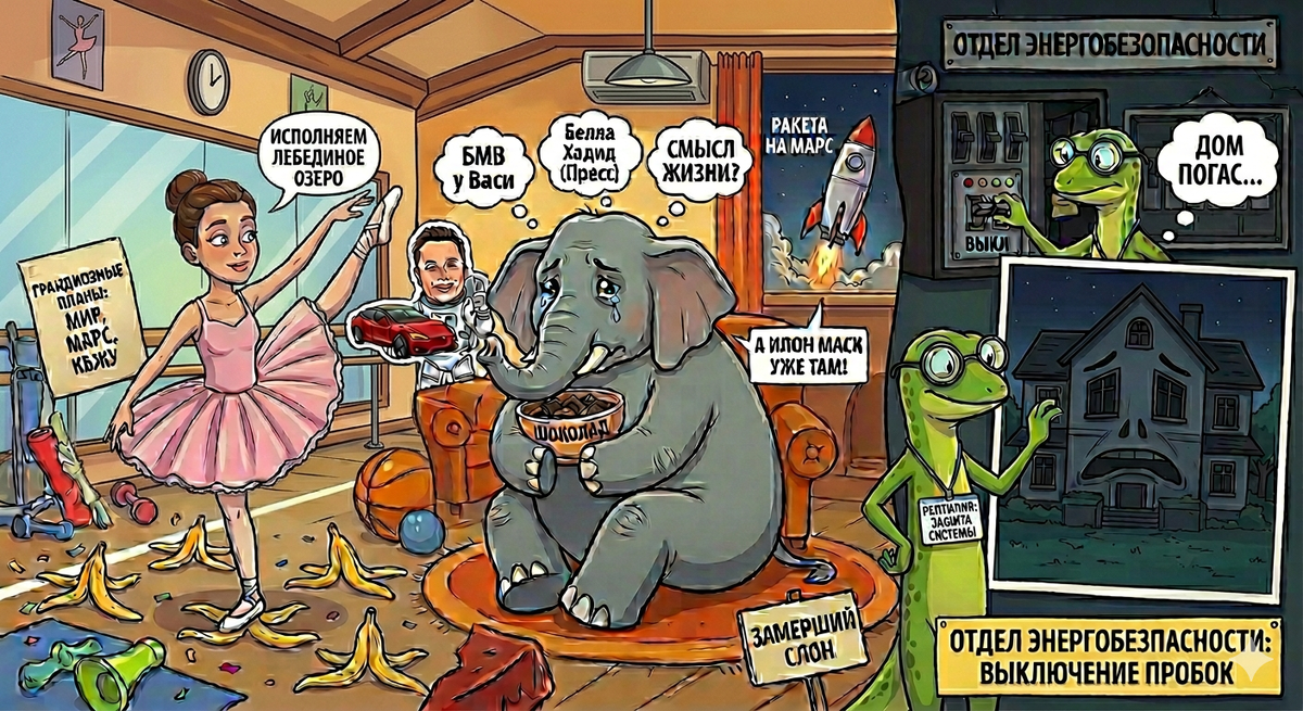 Если вы чувствуете, что ваша жизнь превратилась в бесконечный список «Должен», а сил нет даже на то, чтобы выбрать сериал на вечер — добро пожаловать в клуб жертв Грандиозности. Здесь мы не только худеем, здесь мы «спасаем мир», «ищем предназначение» и «строим империи» одновременно. Познакомьтесь с теми, кто ведет эту бесконечную планерку в вашей голове: Грандиозность — это яд, подслащенный мечтой. Всадник рисует картину: «Завтра я просыпаюсь, бегаю, учу Python и становлюсь Идеальным Сотрудником». На работе этот перфекционизм превращается в Конкурс на самую невозмутимую улыбку под давлением дедлайнов. Всадник требует: «Ты должна быть безупречна! Подготовь отчет так, чтобы комар носа не подточил. Твоя задача — станцевать балет на банановой кожуре и не поскользнуться, чтобы начальник сегодня хотя бы промолчал, а лучше — похвалил! Ах, какая профи, она умеет невозможное. Ну просто волшебница». Пока Всадник полирует каждую запятую, Слон впадает в ступор от страха оступиться. Масштаб ожидани