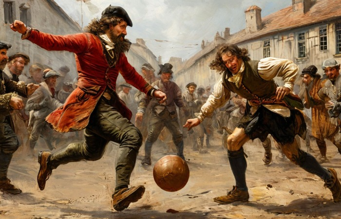 - Средневековая Англия (XII век). На улицах городов проходили массовые игры с мячом, в которых участвовали сотни людей. Правила были примитивны, а матчи нередко приводили к беспорядкам. В 1314 году король Эдуард II даже издал указ, запрещающий игру в пределах города из‑за её разрушительного характера.