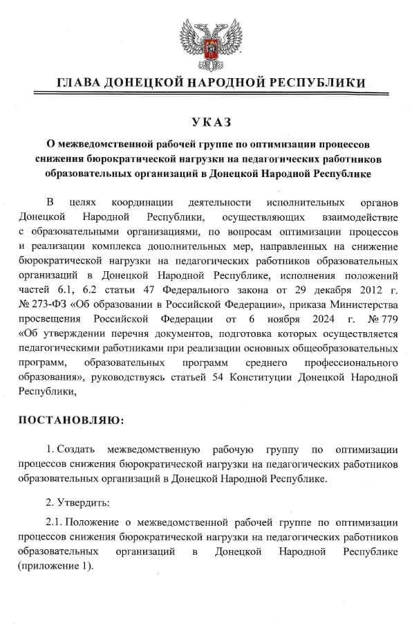 Пушилин создал межведомственную рабочую группу по оптимизации процессов снижения бюрократической нагрузки на педагогических работников образовательных организаций в ДНР