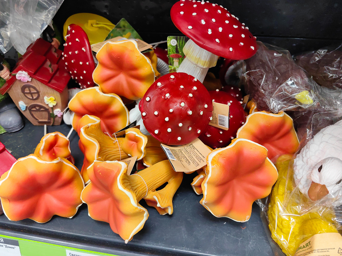 Просто лесная полянка какая-то, не иначе:) Опять новинки в Фикс Прайс, грибы в садовом отделе. Не настоящие, но очень похожи. К светящимся мухоморам добавили фигурки грибов лисичек. Да, для декора в саду. Тоже светятся?