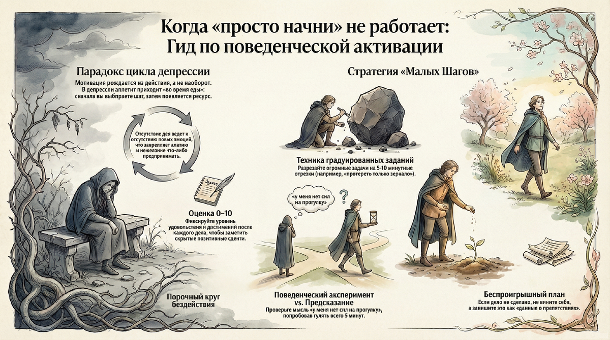В депрессии мотивация не предшествует действию, а рождается из него. Первый шаг делается не потому, что хочется, а потому, что вы выбрали его сделать.