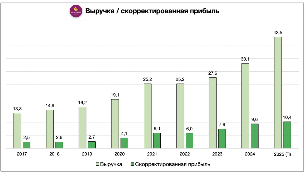 ✔️ Выручка 2025 = 43,45 млрд руб. (+31,1% г/г) ✔️❌ Скор. чистая прибыль 2025 = 10,40 млрд руб. (+8,5% г/г), корректирую прибыль на неконтролирующие доли, восстановление активов и курсовые разницы. Заметно, что темпы роста выручки значительно превышают темпы роста прибыли, частично причина в снижении сальдо финдоходов и расходов на 0,82 млрд руб. Если бы они остались неизменными прибыль выросла бы на 17%. + себестоимость и коммерческие расходы выросли быстрее роста выручки (на 35,8%). ℹ️ Покупка сети клиник Эксперт Существенный рост выручки в 2025 году произошел благодаря покупке сети клиник Эксперт за 8,25 млрд руб. Эксперт принес Мать и дитя 4,63 млрд руб. выручки с 22 мая по 31 декабря. Также Мать и дитя раскрыла, какая была бы выручка компании, если бы Эксперт был