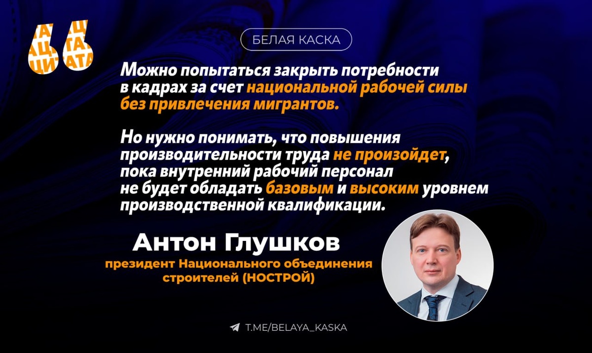 🔵Подготовка кадров требует не менее полутора лет, при этом большинство строительных компаний — это малый бизнес, который не располагает ресурсами для обучения сотрудников. ⭐️ Антон Глушков, глава НОСТРОЙ: Можно попытаться закрыть потребности в кадрах за счет национальной рабочей силы без привлечения мигрантов. Но нужно понимать, что повышения производительности труда не произойдет, пока внутренний рабочий персонал не будет обладать базовым и высоким уровнем производственной квалификации. — Рассчитывать на то, что они даже в краткосрочной перспективе смогут самостоятельно заняться подготовкой кадров для себя, — заблуждение.