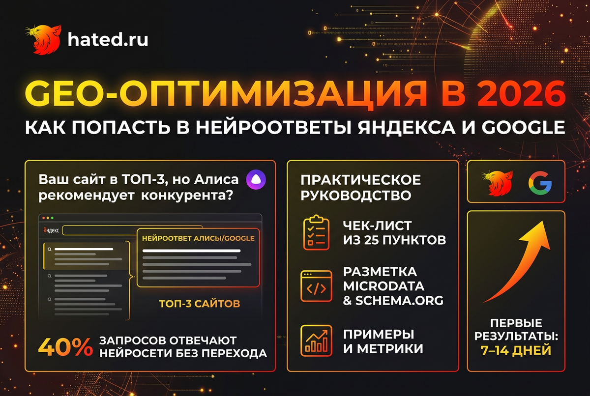 Если ваш сайт уже хорошо оптимизирован — он наполовину готов. GEO добавляет конкретные приёмы: структуру цитируемых фрагментов, разметку Schema.org, работу с репутацией.
