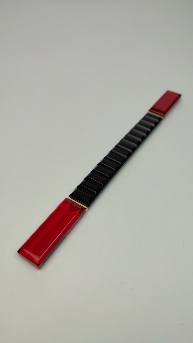 толщина ~ 7-8 мм. Добавлены 2 латунных проставки Чёрная основа в сочетании с насыщенным рубиновым акцентом выглядит строго и дорого. Контраст получился чистый и уверенный — без лишнего, только форма и цвет. Красные окончания добавляют глубину и делают модель более выразительной. Перед конечниками расположены латунные проставки, симметрично с двух сторон — аккуратный тёплый акцент, который подчёркивает переход и завершает композицию. Чётки ощущаются ровными и собранными в руке, с чётким, приятным перебором. Классический, выверенный вариант для тех, кто любит лаконичность и статусный внешний вид.