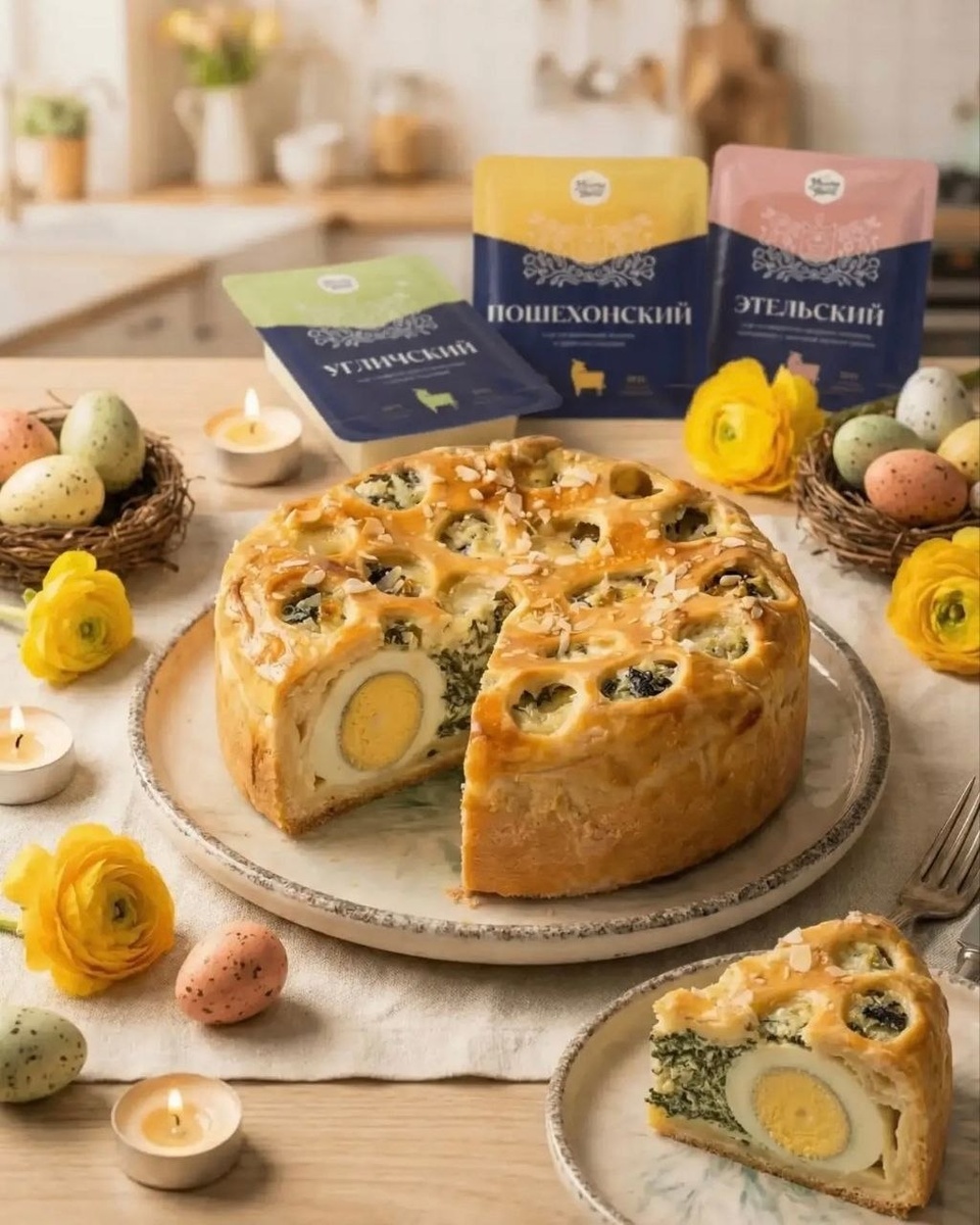Этот сытный пирог — прекрасный выбор для праздничного стола. Он сохраняет свой потрясающий вкус и в холодном, и в горячем виде. Чем больше разного сыра вы используете в начинке, тем интереснее и ярче вкус. Ингредиенты: на 8 порций Для теста: • 70 г сливочного масла • 2 яйца • 280 г муки • 1/2 ч.л. разрыхлителя • 80 г сметаны • 100 мл холодной воды • Щепотка соли • Щепотка перца Для начинки: • 120 г шпината • 180 г творога • 270 г сыра «Углече Поле» • 80 г сливочного сыра • 6 вареных яиц • Яичный желток для смазки Способ приготовления: 1. Взбить масло комнатной температуры в пышную массу, добавить яйца, сметану, соль и перец. 2. В масляную смесь добавить муку с разрыхлителем, влить воду. Быстро вымесить тесто, завернуть в пленку и убрать в холодильник на 30 минут. 3. Пока тесто отдыхает, приготовить начинку. У шпината убрать жесткие черенки, листики помыть и крупно нарезать. Бросить шпинат в кастрюлю с кипящей подсоленной водой и через пару минут откинуть на дуршлаг, чтобы стекл