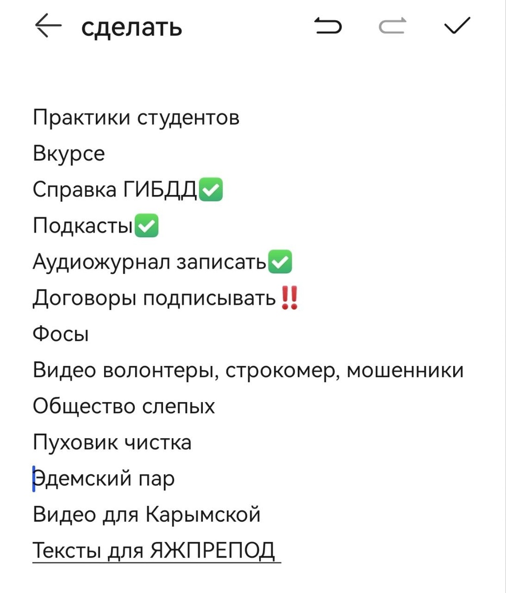 прочее. И каждый вечер планирую завтрашний день. Во сколько и куда пойду, что должна сделать, о чём буду говорить на паре и что спрашивать. Записываю дела в календарь и в специальную заметку (эта вот на сегодня) И каждый раз, завершая планирование, мне хочется немедленно пойти спать - чтоб скорее наступил завтрашний день и я всё это сделала. И снова всё успела, конечно😊 Выходные я тоже планирую
