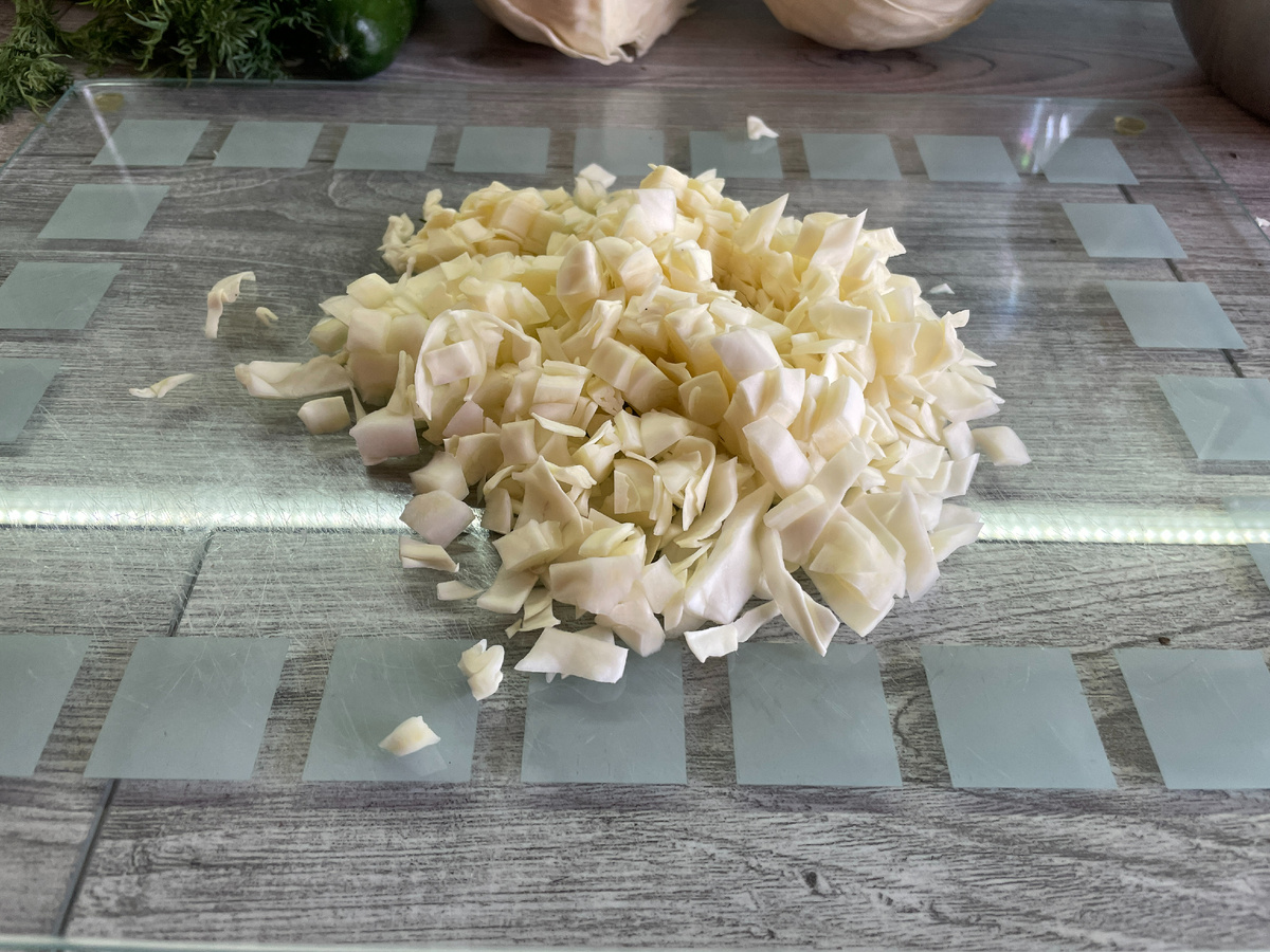 500 граммов капусты подвергаются мелкокалиберной нарезке.