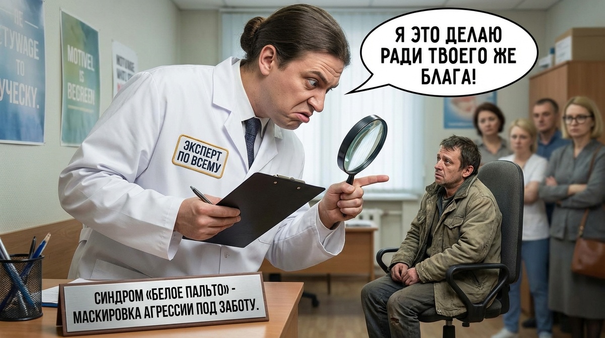 Этот диалог — не медицинский случай. Это чистая метафизика повседневности. Синдром «белое пальто» (мем, родившийся из плаката Валерии Новодворской: «Вы все дураки и не лечитесь! Одна я умная, в белом пальто стою красивая!») — квинтэссенция поведения человека, который самоутверждается за чужой счёт, маскируя агрессию под заботу.