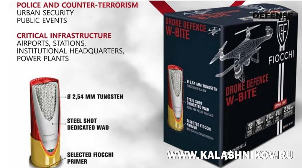 Охотничьи патроны для гладкоствольных ружей с вольфрамовой дробью за рубежом выпускаются уже несколько десятилетий, но никогда не пользовались особым спросом прежде всего из-за высокой стоимости. Автор – главный редактор журнала «КАЛАШНИКОВ» Михаил Дегтярёв Но, с появлением новых угроз на поле боя у вольфрама появился шанс стать более востребованным. Два года назад итальянская фирма Fiocchi представила специальные антидроновые патроны 12 калибра с вольфрамовой дробью, а в марте 2026 года показала автоматные патроны, разработанные для борьбы с БПЛА. Самое интересное, что снаряжены эти патроны не набором последовательно расположенных шаровидных поражающих элементов или составной пулей, а опять же вольфрамовой дробью. Для патрона 5,56×45 в латунный контейнер с полимерным наконечником помещается 23 вольфрамовых дробинки диаметром 2 мм. Масса дробового снаряда составляет 5 г, а эффективная дальность стрельбы по дронам заявляется 50–70 м при начальной скорости снаряда 580 м/с. Антидроновый п