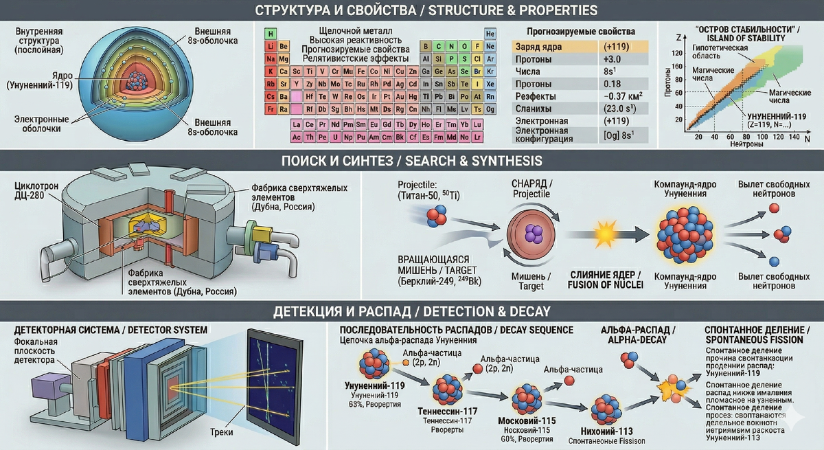 Мы все помним таблицу Менделеева со школы. Большинству кажется, что она давно завершена, но на самом деле таблица — это живой, развивающийся организм. Прямо сейчас в подмосковной Дубне, в Объединенном институте ядерных исследований (ОИЯИ), физики пытаются сделать то, что навсегда впишет их имена в учебники химии: открыть 119-й элемент. И об этом грандиозном научном детективе говорят непозволительно мало. Временно он носит невзрачное латинское название Унуненний (Ununennium), что буквально означает «один-один-девятый». Как только он будет официально зафиксирован, ему дадут нормальное имя — возможно, в честь какого-то ученого или географического объекта (как это было с московием или оганесоном). Открытие 119-го элемента — это не просто добавление новой клеточки. Это открытие абсолютно нового, восьмого периода в таблице Менделеева. По своим химическим свойствам этот сверхтяжелый металл должен стать «родственником» натрия и калия (встать под францием в первой группе). Элементы с 114-го по