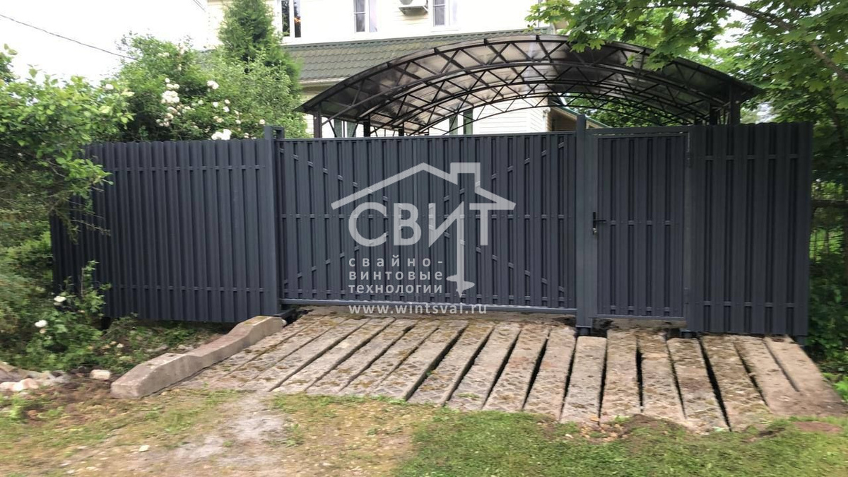 установить откатные ворота, забор и навес под автомобиль. Но участок оказался не таким простым, как кажется на первый взгляд: — заезд усилен ЖБ шпалами