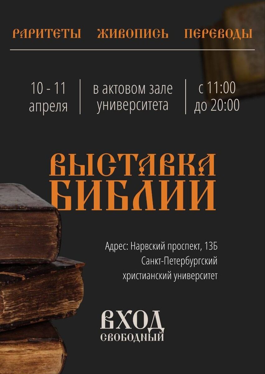 прикоснуться к подлинным древностям, увидеть редкие старинные экспонаты из коллекции Музея Библии Санкт‑Петербурга — у вас есть уникальная возможность. ✅ 10 и 11 апреля на выставке, которую организует Санкт‑Петербургский христианский университет, представлены картины известных художников на евангельские сюжеты. А миссия «Уиклиф» познакомит вас с переводами Библии на языки малых народов России. Вы увидите не только переводы, но и сможете сфотографироваться в традиционных национальных костюмах тех народов, для которых Слово Божье впервые зазвучало на родном языке. ✅ Приходите, ждём вас по адресу: Санкт‑Петербург, Нарвский проспект, 13Б.