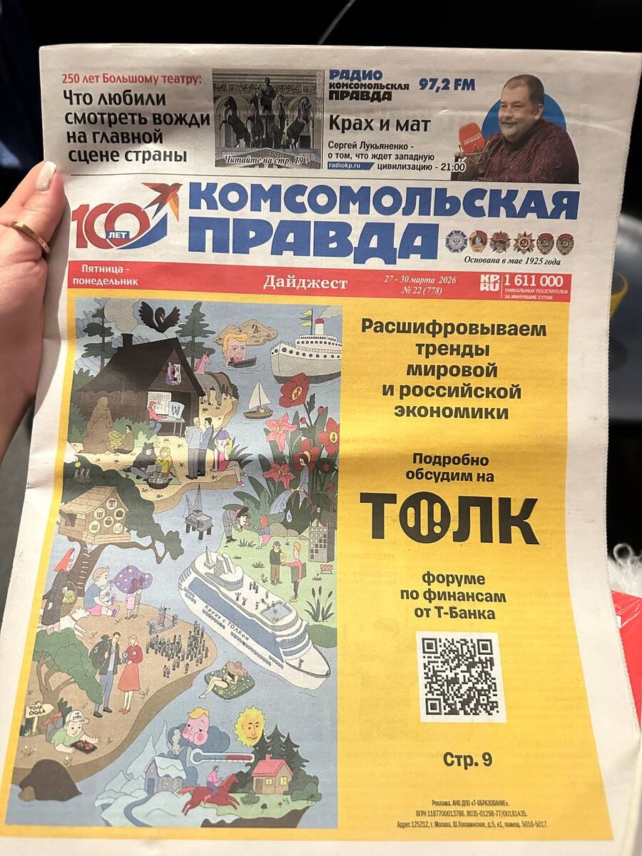 Друзья, когда летела обратно из Москвы в Сочи увидела газету «Комсомольская Правда» где наш любимый желтый банк напоминал об онлайн-конференции ТОЛК, которая начнется 1 апреля Почему бы и мне не напомнить вам о возможности подтянуть свою финансовую грамотность ? Заходим на сайт регистрируемся с моим промокодом, который дает право на 30% скидку и выбираем наиболее интересные дни или смотрим всё что интересно! Промокод KAPMARVV 30% скидка на тарифы Стандарт, Стандарт+ ссылка на регистрацию https://t-tolk.ru/?utm_source=spik&utm_medium=kapmarVV Вперёд за знаниями 🚀