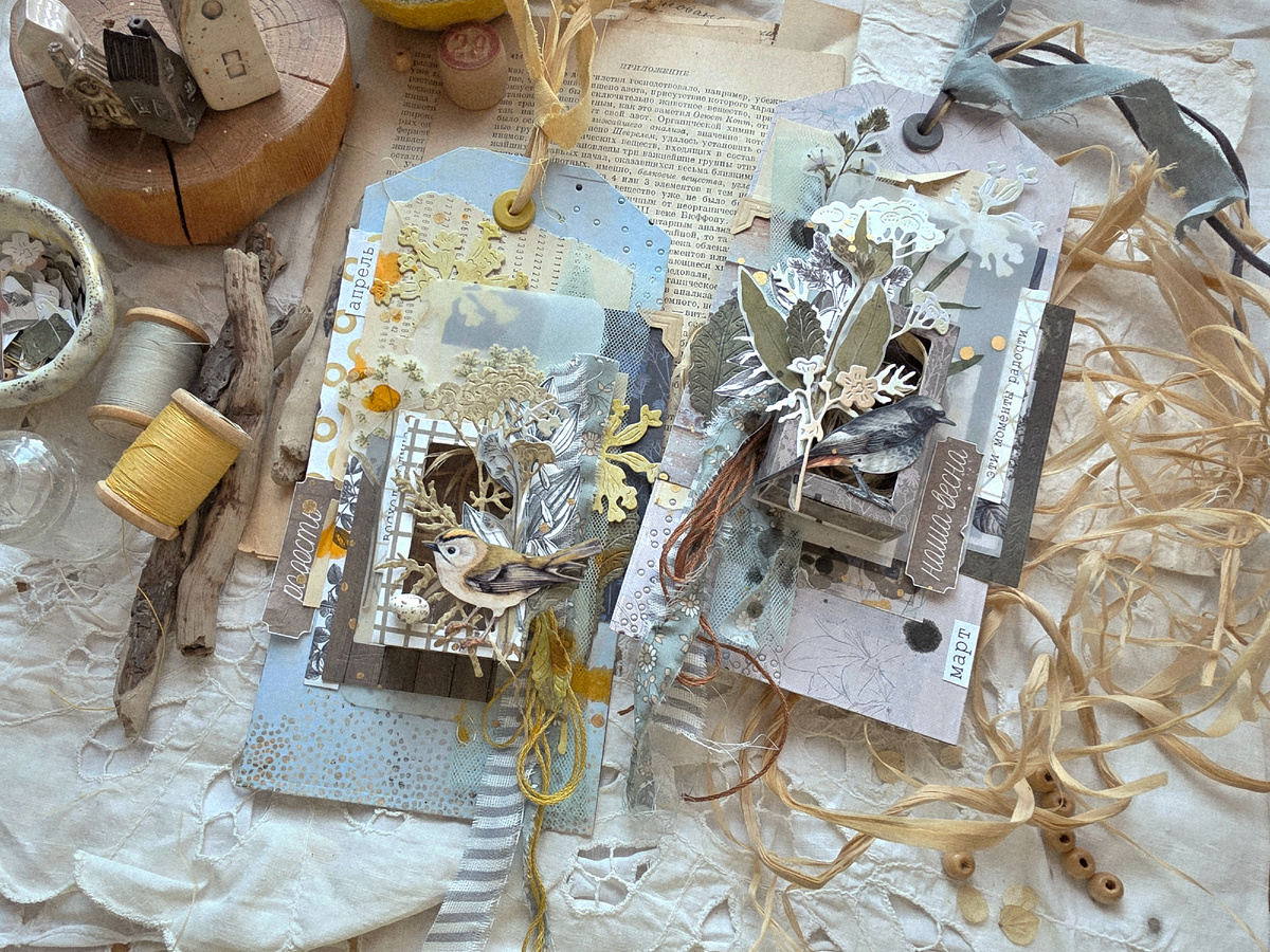 Всем солнечный привет, с вами Наташа Конохова) Весна за окном неумолимо топит снега, снимает шарфы, зажигает глаза и улыбки на хмурых уставших лицах. Каждое утро нас будят птичьи трели, спасибо за это бору неподалеку. Именно о них будут мои тежики... Вдохновилась чудесным квартетом: нашими новыми коллекциями "Люби, лети, твори" и "Давай дружить" (отсюда взяла чудесные карточки), из старинок взяла "Бумажные птицы" и "Дюймовочка". Родились эти милаши, каждый про свой месяц. Один - мартовский, чуть мрачный древесный, пропитаный студеным ветром, первой зеленью и надеждой. Несут ее первые птицы, вернувшиеся из дальних странствий. Другой - апрельский, полон солнца, тепла, лучиков и щебета веселых стаек. В каждом своя магия, трепет и чудеса. А где же майский, спросите вы?) Скоро и он родится, стоит лишь дождаться мая... Совсем скоро, с теплыми мыслями!