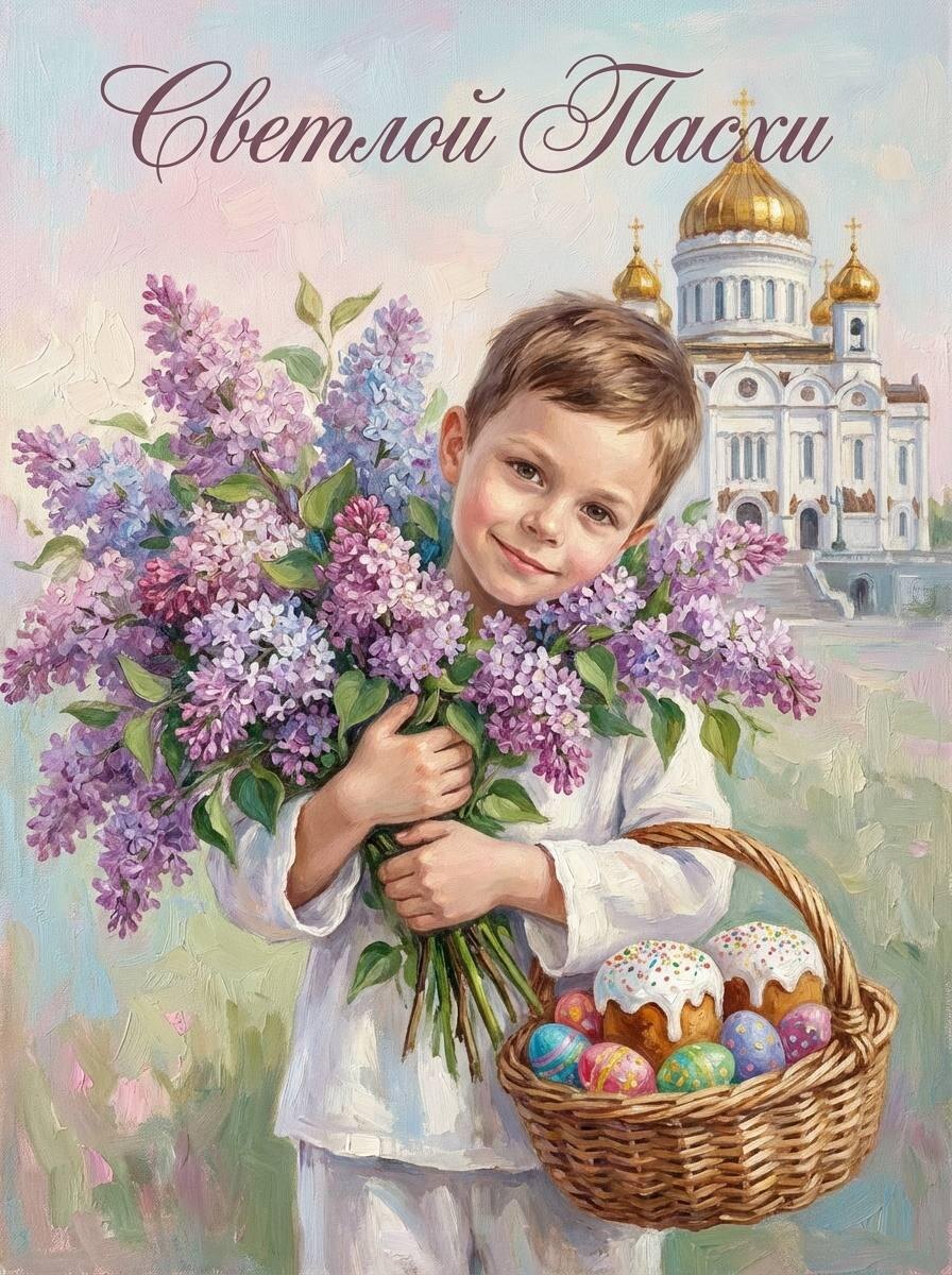 » Сгенерировать фото⚡️ Перейти в бота 🤖 Создай портрет, не меняя черты лица. Живописный портрет в стиле масляной живописи, выполненный в мягких весенних пастельных тонах. Вертикальная композиция. Ребёнок одет в белую одежду из льна, Он обнимает огромный букет сирени и держит в руках плетеную корзину с ярко\-разукрашенными пасхальными яйцами и пасхальными куличами с белой глазурью, и посыпкой. Фон — белый храм с золотыми куполами. Видны мазки масляной краски, фактура холста. Текст в свободной зоне элегантным каллиграфическим шрифтом: «Светлой Пасхи» (на русском языке) Мягкий рассеянный дневной свет, тёплая палитра, атмосфера нежности и уюта. Высокое разрешение, детализированная текстура мазков.