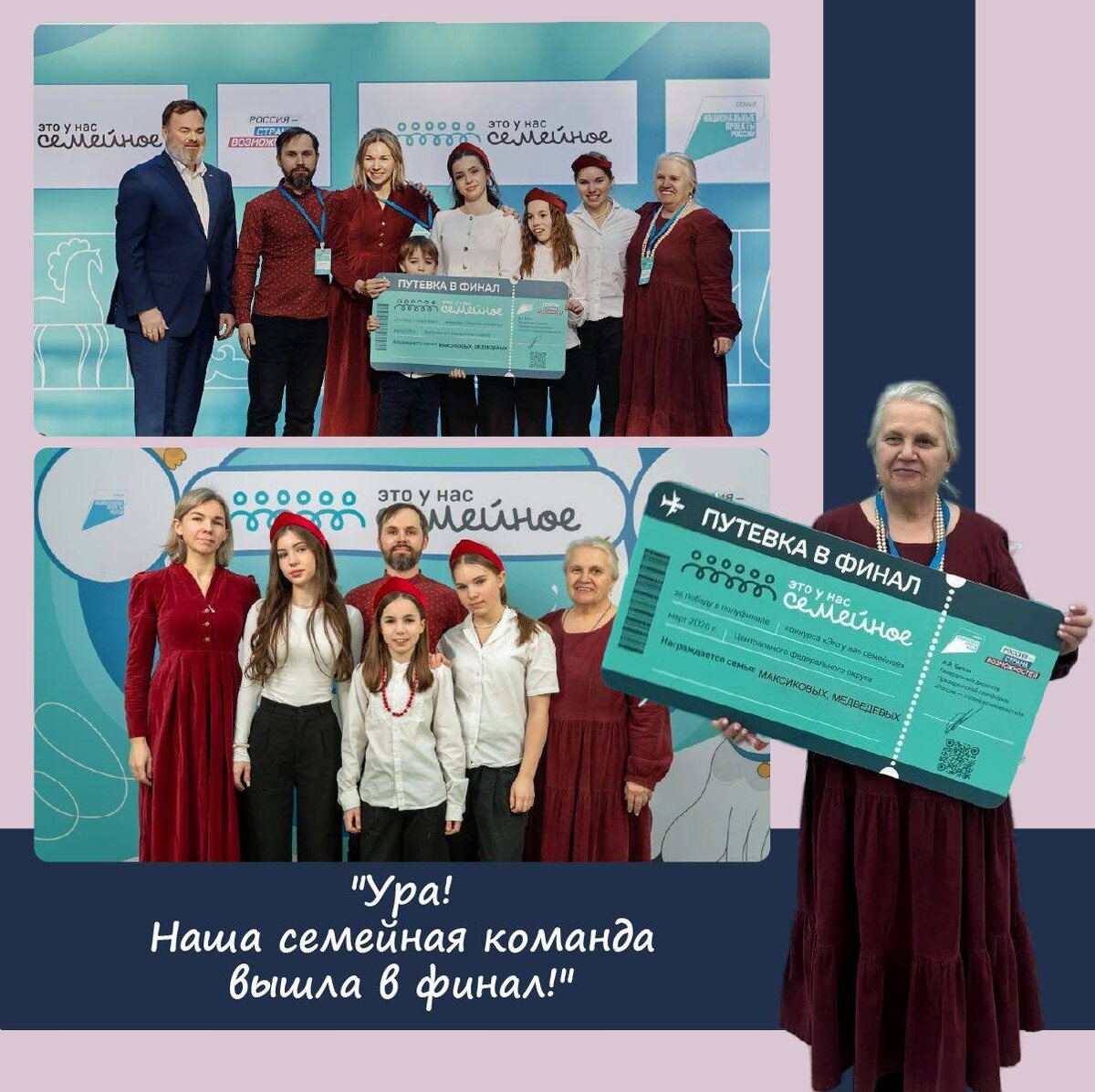 ! Во 2-м сезоне Всероссийского конкурса «Это у нас семейное» мы вышли в финал. 🏆 Что помогло нам преодолеть планку прошлого года, когда до победы не хватило всего одного очка? Мы учли свои прошлые недочёты. Например, неумение, попросту говоря, поиграть. Ведь это соревнование — как большая игра! Важно получать удовольствие, радоваться вместе со всеми, просто радоваться жизни. ✨ Или, как сказал на открытии 2-го сезона один из участников финала 1-го сезона: «Будьте самими собой. Не надо никому ничего доказывать!» Это нам очень помогло. Действительно: в чём-то мы сильны, в чём-то чуть слабее. И мы не переживали, а на каждом этапе делали, что могли. Сохраняли спокойствие, поддерживали друг друга. Искренне радовались успехам других, общались с другими участниками. Старались, чтобы напряжения было как можно меньше. И это помогло нам выйти в финал! 🤗 Теперь у нас есть путёвка в финал - Вы видите это на фотографии... Ждём, когда пригласят. Пожелайте нам удачи! 🍀 И, конечно же, слава