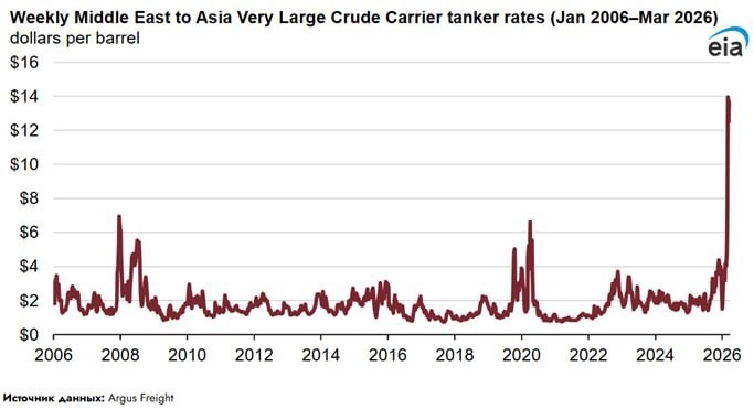 В марте 2026 года ставки фрахта супертанкеров (VLCC), следующих из Ближнего Востока в Азию, достигли самого высокого уровня как минимум с ноября 2005 года, когда начали регистрироваться данные. Рост цен последовал за закрытием Ираном Ормузского пролива 2 марта. Стоимость перевозки нефти достигла $14 за баррель при среднем многолетнем уровне в $2 за баррель К рекордно высоким ставкам привели физический риск нападений на суда, пытающиеся пройти через Ормузский пролив, а также высокая стоимость страхования от военных рисков @geonrgru | 🇷🇺 MAX | sponsr.ru