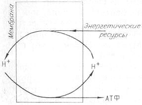 Представим простую схему протонного (электронного) цикла (рис. 6). С помощью белков клетка способна использовать энергию света, перенося водородные ионы и, соответственно, электроны через мембрану. Таким способом создается разность потенциалов, электрохимический градиент. А он и будет движущей силой процесса, в данном случае химического. Его величина, порядка 0,25 В, вполне достаточна, чтобы компенсировать потери энергии при синтезе АТФ из АДФ. На каждую синтезированную молекулу АТФ, этой энергетической валюты, «расходуется» два Н+, т. е. два протона обратно возвращаются через мембрану. Так работает цикл. Энергетические ресурсы клетки могут быть разнообразными для авто- и гетеротрофов, в последнее время много работают с бактериородопсином как источником электрохимического потенциала. Этот светочувствительный белок наряду с широко известным хлорофиллом также можно назвать генератором электрического тока. У эукариотных гетеротрофных клеток энергодающим источником является глюкоза, а образование АТФ связано с мембранами митохондрий. Последние образно называют «электростанциями клетки». Теперь, в связи с пониманием протонного цикла, оказалось, что это вовсе не метафора. А в целом, по энергетике, автотрофную клетку можно назвать «фотоэлектрическим элементом», а гетеротрофную — «электрохимическим элементом» на основе циклов.